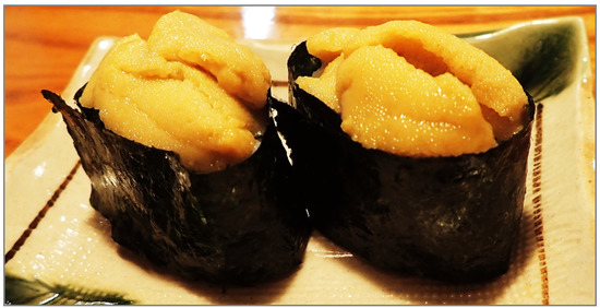 Sushi made with Mesocentrotus nudus gonads, which were evaluated as high-quality by a chef from a sushi restaurant with a Michelin 3-star rating in Tokyo (photo by S. Takagi).