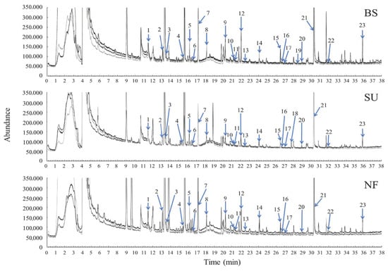 Chromatograms of odor-active organic compounds in the gonads of Mesocentrotus nudus using gas chromatography–mass spectrometry (N = 3). BS, SU and NF indicate sea urchins fed with the basal frond portions of Saccharina japonica, sporophylls of Undaria pinnatifida and no food, respectively. Compounds are identified by peak numbers, as shown in Table 1.