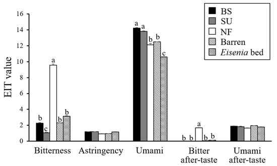 Estimated intensity of taste (EIT) of gonads of Mesocentrotus nudus fed experimentally or obtained directly from the wild. Experimentally fed: BS, fed with the basal frond portions of Saccharina japonica; SU, sporophylls of Undaria pinnatifida; NF, no food. Wild sea urchins: “Barren”, collected from a seabed barren; “Eisenia bed”, from an Eisenia bicyclis bed. Bars indicate mean EIT ± SE. Lower-case letters indicate more than one-unit difference in each EIT among groups, indicating a recognizable difference in taste by humans [30].