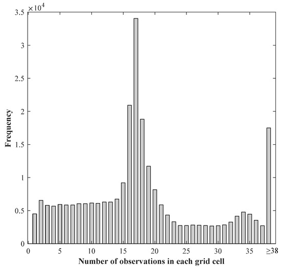 To determine the eight unknown parameters, at least eight observations are needed in each grid cell. The numbers of observations that fall in each grid cell are calculated. Figure 1 shows the frequencies of the numbers of observations in each grid cell. Approximately 84.72% of grid cells have eight or more observations to constrain each solution. To fill data gaps in the 5 km grid, we duplicate the calculation with a 10 km resolution grid. Missing data in the 5 km grid are filled by the re-sampled 10 km grid. By using this model fit method, we are able to generate sea ice thickness estimates, which are not affected by the uncertainty in the snow depth and density parameters.