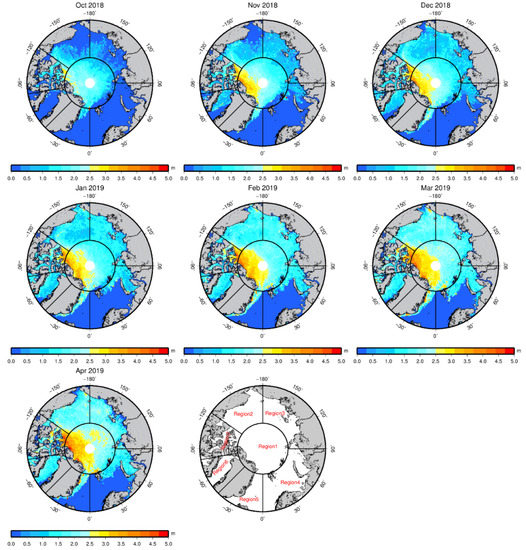Arctic sea ice thickness distribution with the least squares adjustment (LSA) method for the 2018–2019 Arctic sea ice growth season from October to April. The thickness distribution is presented in seven regions, region 1: Arctic Ocean; region 2: Beaufort and Chukchi Seas; region 3: Laptev and East Siberian Seas; region 4: Kara and Barents Seas; region 5: Greenland Sea; region 6: Baffin Bay; and region 7: Canadian Arctic Archipelago.