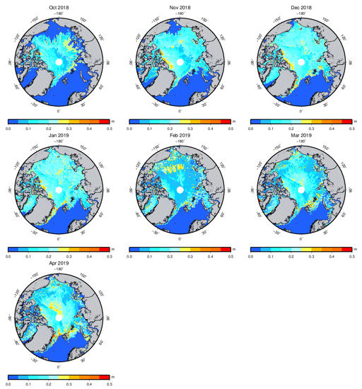 Arctic sea ice thickness estimation uncertainty with the LSA method for the 2018–2019 Arctic sea ice growth season from October to April.