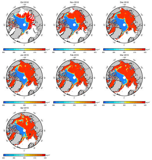 We can also derive sea ice density from by setting sea water density as a fixed value (1024 kg/m3). Figure 4 shows the sea ice density distribution for the 2018–2019 Arctic sea ice growth season from October to April. It can be easily found that the thin ice density is larger than thick ice density. Thin ice density ranges from 915 to 920 kg/m3, while the thick ice density ranges from 880 to 885 kg/m3.