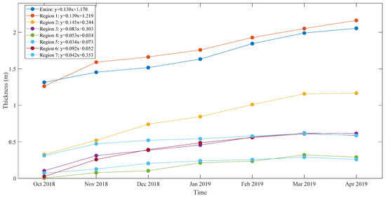 During the 2018–2019 sea ice growth season, the thickness growth rate of the entire Arctic Basin is approximately 13 cm per month. In October, the sea ice thickness is the smallest, with an average value of 1.315 m, and a few thick ice packs can be seen off the northern coast of the Canadian Archipelago. Afterward, the sea ice thickness increases over the course of the sea ice growth season. In November, more thick ice appears in region 1 and north of region 7, and thin ice begins to appear in the south of regions 2, 3, 4, and 6. In December, the ice thickness growth rate is small (6.4 cm per month), and more thin ice appears in the southwest of region 2. In January, more thick ice occurs in region 1. In February, the ice thickness experiences the largest growth rate (21.2 cm per month). In March, the thick ice area continues to expand. In April, the ice growth rate decreases to 6.5 cm per month, but more thick ice appears in the eastern part of region 1.
