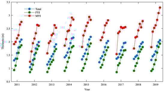 Monthly average thickness variations of the Arctic sea ice derived with the LSA method are shown in Figure 6. Seasonal variations can be clearly found in the Arctic sea ice thickness. The total ice thickness increases each month over a given sea ice growth season from October until April, which is also generally true for the thickness of FYI and MYI. In some years (e.g., 2012, 2013, 2014, 2015), the MYI thickness drops slightly from March to April due to the onset of summer melt. The variations of total ice thickness are close to the variations of FYI thickness with a correlation coefficient of 0.916 (0.817 for MYI thickness versus total ice thickness), which indicates that FYI is the dominant ice type, because the MYI extent is now less than one-third of the Arctic Ocean [42].