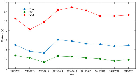 Figure 7 shows the annual variations of the Arctic sea ice thickness from 2010/2011 to 2018/2019. The annual average thickness value represents the mean ice thickness during a given sea ice growth season from October (November for 2010) to April. The thickness of Arctic sea ice has undergone large inter-annual fluctuations. We can observe that MYI is the most variable ice type. Between 2010/2011 and 2011/2012, MYI thickness declined by 10% (0.229 m), followed by an increase of 23% (0.446 m) from 2011/2012 to 2014/2015 and a decrease of 6% (0.158 m) from 2014/2015 to 2018/2019. The thickness of FYI cover is much less variable than that of MYI. From 2010/2011 to 2012/2013, FYI thickness declined by 9.6% (0.143 m), followed by an increase of 9.8% (0.131 m) in 2013/2014 and a decrease of 7% (0.104 m) from 2013/2014 to 2017/2018 and a slight increase of 1.8% (0.024 m) from 2018/2019. These changes impact the total Arctic sea ice thickness, which declined by 9.9% (0.168 m) from 2010/2011 to 2012/2013, increased by 18% (0.278 m) from 2013/2014, decreased by 7.6% (0.138 m) from 2013/2014 to 2017/2018, and increased by 1% (0.017 m) in 2018/2019. The annual variation of FYI thickness is similar to the variation of total ice thickness, which is consistent with the seasonal variations. As shown in Figure 7, the mean thickness for the total sea ice during the growth season is smallest from October 2012 to April 2013. A sharp increase in total sea ice thickness in 2013/2014 can also be found in Figure 7. Kwok et al. [11] also found a notable increase in 2013 when estimating the Arctic sea ice thickness and volume with CryoSat-2 data from 2010 to 2014. Tilling et al. [12] also found a sharp increase in Arctic sea ice volume in 2013 and 2014 with CryoSat-2 data. Tilling et al. [12] pointed out that the increase was caused by the remaining thick sea ice northwest of Greenland over the summer of 2013. This is associated with the anomalous low temperature in 2013, which caused a 5% drop in the number of melting days.