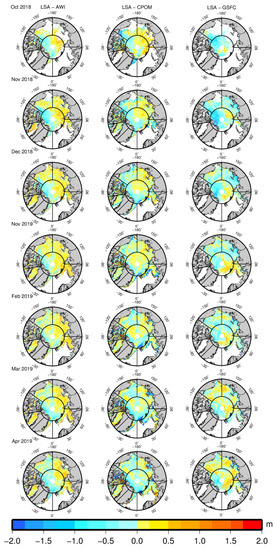 The GSFC product does not provide thickness estimates in regions 5 and 6. The difference between the LSA and GSFC is −0.274 ± 0.628 m. The bias for the entire basin of the two products reaches a maximum (−0.531 ± 0.577 m) in October, reduces as the growth season progresses, and reaches a minimum (−0.118 ± 0.687 m) in April. Region 7 shows the largest bias (−0.516 ± 0.864 m) of the seven regions, while region 2 features the lowest bias (−0.167 ± 0.423 m). The bias in region 1 is −0.345 ± 0.757 m during the entire season. In October, most of the bias in region 1 is negative, whereas more positive bias appears as the growth seasons progresses, especially in the western part of region 1. This phenomenon can also be found in regions 2 and 3. Limited ice is found in region 4 during October, and the bias is extremely large (−2.144 ± 0.005 m).