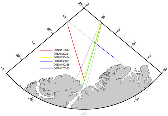 Operation IceBridge (OIB) is a NASA program of airborne remote sensing measurements designed to fill the gap in measurements between ICESat and ICESat-2. OIB can obtain sea ice thickness estimates by onboard instruments including the airborne topographic mapper and snow radar. Here, we employ the OIB sea ice thickness datasets available at the National Snow and Ice Data Center (NSIDC) [25] to validate our sea ice thickness results. The datasets consist of measurements from the Airborne Topographic Mapper laser altimeter, Digital Mapping System camera, and the University of Kansas’ 2–8 GHz snow radar. Sea ice thickness is available at a 40 m spatial sampling resolution along the flight lines.