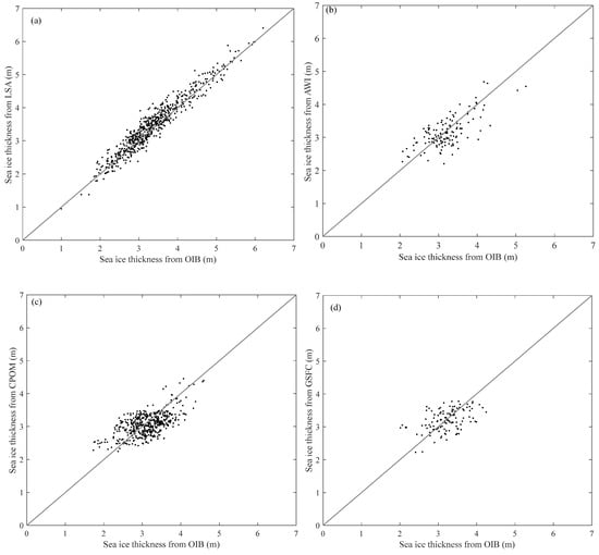 Scatterplot of the sea ice thicknesses from the LSA and the three sea ice thickness products versus those from the OIB, (a) LSA vs. OIB, (b) AWI vs. OIB, (c) CPOM vs. OIB, and (d) GSFC vs. OIB.