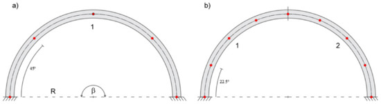 The deep curved arch is considered to assess the applicability of the present element to model an arch with a large subtended angle. The deep arch is modeled with a curved beam clamped at each end, subjected to uniformly distributed load q = 1 KN/m. The beam is considered to have a radius R = 5 m, an opening angle β = 180°, and a rectangular cross-section with height h = 0.5 m (R/h = 10) and width b = 0.3 m (Figure 9). The mechanical properties remain unchanged with respect to the previous cases.