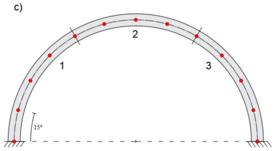 - Kikuchi, F. On the validity of the finite element analysis of circular arches represented by an assemblage of beam elements. Comput. Meth. Appl. Mech. Eng. 1975, 5, 253–276. [Google Scholar]