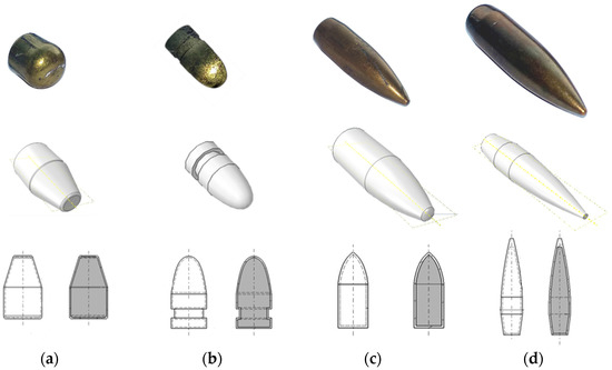 The real and virtual geometry of bullets used in the experimental study: (a) 9 mm × 19 mm Parabellum, (b) 9 mm × 29 mm (0.38 “Special”), (c) 7.62 mm × 39 mm (AK ammunition) and (d) 7.62 mm × 51 mm (0.308 Winchester ammunition).