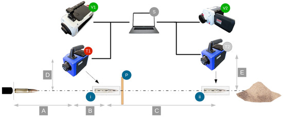 To measure the magnitudes of bullet temperature and velocity, a new testing protocol was designed. The scheme of the setup for testing devices is presented in Figure 3. Measurements were done at frame (i) and frame (ii). Frame (i) is the distance of A + B from the shooting position to the beginning. A represents the distance between the shooter and the position of the first cameras. B represents the distance between the thermal camera, T1, and the frame (i). The second measurement was done at frame (ii), namely A + B + C distance from the shooter before reaching the sand state. C represents the distance between the two frames (i) and (ii).