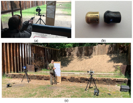 The thermal camera was positioned so that its viewing window was positioned on the trajectory of the bullet. The shooter was 3 m away from the target (A = 2 m, B = 1 m, C = 40 m), as seen in Figure 4a. It should be underlined that the distance A should be a large enough field of observation to avoid the intrusion of smoke and dust effects that arise from releasing a bullet from a barrel (depending on the gun or bullet, the distance A may differ). Furthermore, since the thermal camera is sensitive to reflections and shiny surfaces, the metallic reflections of the bullets could compromise the results obtained. Thus, to avoid the shining effect, the bullets were covered with a black marker to give them a dark matte colour, as shown in Figure 4b.