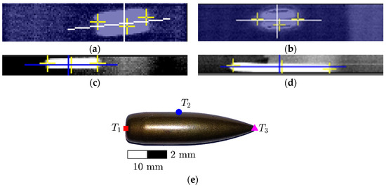 Selected data recorded during all tests are presented in tabular form in Appendix A. Table A1, Table A2, Table A3 and Table A4 in Appendix A include velocity VI and temperatures TI,1, TI,2, and TI,3 recorded at frame (i). Temperatures TI,1, TI,2, and TI,3 were measured at the bullet nose, side and rear, respectively. Part of the results had to be classified as secret due to the requirements of the government agency which financed the research presented. Thus, the measurements of VII and TII,1, TII,2, and TII,3 at frame (ii) were not included. For the four calibers, namely 9 × 19 mm, 9 × 29 mm, 7.62 × 39 mm, and 7.62 × 51 mm, 6, 11, 23, and 4 shots were properly recorded, respectively. Examples of frames captured during tests by the FLIR thermal camera for each caliber are presented in Figure 6a–d. Furthermore, for clarity, the location of the temperature measurement points (Ti, I = {1, 2, 3}) are shown in Figure 6e.