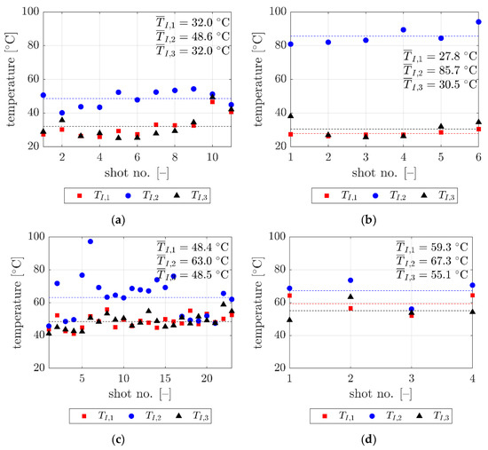 Temperatures measured at frame (i) for the tested types of bullets ((a) 9 mm × 19 mm Parabellum, (b) 9 mm × 29 mm 0.38 “Special”, (c) 7.62 mm × 39 mm AK, and (d) 7.62 mm × 51 mm 0.308 Winchester) and at different parts of the bullet (TI,1, TI,2, and TI,3). Mean values are marked by dashed lines.