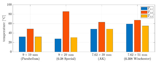 For the four different types of bullets, the highest temperatures were seen from the side of the bullet. The temperatures of the rear of the bullets were close to the temperatures of the nose. The largest gap between the side temperature and the temperature of the nose and the rear was for the 9 × 29 mm bullet, which measured a difference of about 55 °C. This phenomenon can be explained by the unique geometry of this bullet; for example, it is the only bullet that has a machined groove. In other cases, the same difference (side temperature versus rear and nose temperature) was about 11–17 °C. Furthermore, the shorter bullets (i.e., 9 × 19 mm, 9 × 29 mm) had nose and rear temperatures that were 15–25 °C lower than their longer counterparts (i.e., 7.62 × 39 mm, 7.62 × 51 mm). The side temperature differences for the different types of bullets were, therefore, inconsistent with each other.