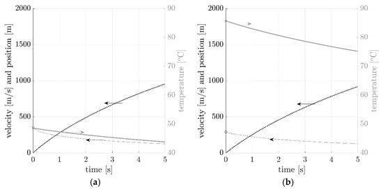 In Figure 9, the relationship between velocity (dashed line), temperature (continuous line), and position (dotted line) are presented. The plots were computed for all bullets using the system of Equation (15), with the initial temperature and velocity taken from the experiments conducted in this study. Considering one of the example, i.e., AK ammo with 7.62 mm × 39 mm bullet, the average initial temperature of the bullet was 63 °C. The average initial velocity was equal to 753 m/s (see Appendix A, Table A3). The bullet leaving the barrel is hot and cools down over the course of the flight. This phenomenon is apparent on the graph given that there is a decrease in temperature during the flight. After 5 s, the temperature decrease predicted was approximately 8 °C. The distance travelled was predicted to be about 1650 m. It should be underlined that no vertical (ground) limit was assumed in the system of Equation (15). The bullet velocity also decreased to about 220 m/s after 5 s. Although 5 s appears to be a long period for such phenomena, it is included to show the non-linear character of the position, velocity, and temperature plots.
