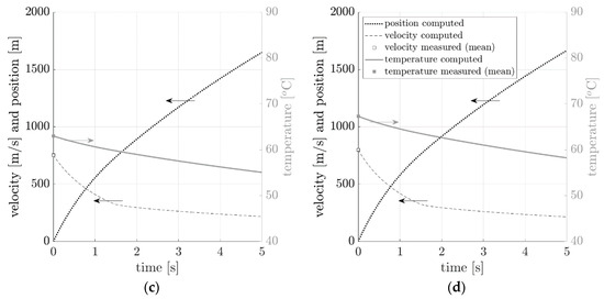 Temperature, velocity, and position plots for all bullets considered: (a) 9 mm × 19 mm Parabellum, (b) 9 mm × 29 mm (0.38 “Special”), (c) 7.62 mm × 39 mm (AK ammo), and (d) 7.62 mm × 51 mm (0.308 Winchester) obtained from a system of Equation (15).