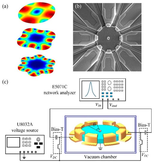 As shown in Figure 1c, with the central disk grounded, an AC signal together with a DC bias voltage were applied to the driving electrode using the bias-T; meanwhile, another DC bias voltage was applied to the sensing electrode to extract the motional current. The span angle of the electrode θ is critical for multi-mode excitations. According to dependence of the motional current on the span angle for each mode, the optimal angle of an individual mode is π/n. A small angle cannot provide sufficient electromechanical couplings for low-order modes, while the large one will suppress the high-order modes. Therefore, a traded-off value of 34° was employed [22]. The three-layer self-aligned process was adopted to batch fabricate the 37 μm and 18 μm-radius WGM resonators [28]. The nano-scale spacing gap of 70 nm was made via the thermal oxidation to reduce the impedance. The low pressure chemical vapor deposition low pressure chemical vapor deposition (LPCVD) device layer with nearly zero stress yielded a higher reliability and reduced energy dissipation. The fabricated resonator is shown as Figure 1b.