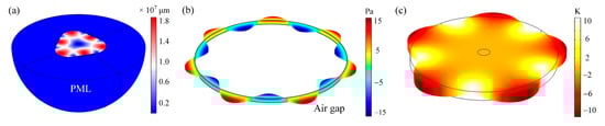 The simulated displacement distribution of the WGM resonator as well as the substrate (a), the varied pressure profile of the air gap (b), and the temperature distribution (c).