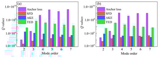 The stem radii of the 37 and 18 μm-radius resonators are 3 μm and 1.5 μm, respectively. Pursuant to (22), with similar stem to disk radii ratios, the Qanchor values of each mode should be very close; however, the simulations exhibit clear difference. The discrepancies can be caused by the supporting stem, which is modeled as a longitudinal rod subjected to the time-harmonic vibrations with the resonance frequency fn. The height and radius of the supporting stem affect the wave propagations from the disk to the substrate, leading to the Qanchor values different from the expectation [46].