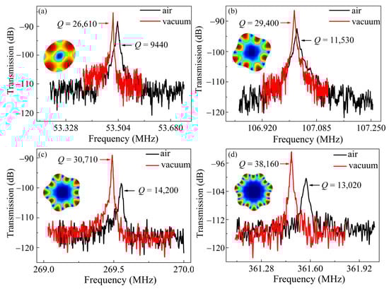 The devices were subsequently tested in vacuum. A Lakeshore CRX-4K probe station was employed to provide a high vacuum of 8 × 10−5 bar. For different WGMs, Q enhancements exceeding 2 times were achieved. As shown in Figure 4a,b, for the 2nd and 4th WGMs of the 37 μm-radius resonator, the Q improves from 9440 to 26,610, and from 11,530 to 29,400, respectively. The similar tendency can be obtained for the 18 μm-radius counterparts. Figure 4c,d show that for 5th and 7th WGMs, the Q improves from 14,200 to 30,710, and from 13,020 to 38,160, respectively. An outperforming f × Q product up to 1.38 × 1013 was implemented. The substantial Q enhancements of all the WGMs infer that the SFD is a major loss source even for high-order modes. By contrast, the traditional high-order BAW modes are insensitive to the SFD due to the increased stiffness [16,47]. The resonance frequency shift could be attributed to the effect of hydrostatic pressure. The bulk elastic modulus goes down with the decreasing pressure [48], which leads to a reduced frequency.