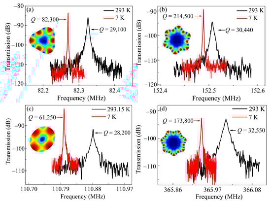 The measured frequency responses for the 37 and 18 μm-radius resonators at 7 K are given in Figure 5. As can be seen, the Q of the 3rd mode for the 37 μm-radius resonator at 7 K is 82,300, and relative to the Q of 29,100 at room temperature, the enhancement is only 2.83 times (Figure 5a). By contrast, the Q in the 6th mode boosted from 30,440 to 214,500 at 7 K (Figure 5b), which achieves a promising enhancement of 7.05 times. The 18 μm-radius counterparts exhibit the similar tendency. As shown in Figure 5c,d, the Q values of the 2nd and 7th WGMs at room temperature were 28,200 and 32,550, and were raised up to 61,250 and 173,800 at 7 K, corresponding to the enhancements of 2.17 and 5.34 times, respectively. Besides, an outperforming f × Q product up to 6.36 × 1013 of the 7th WGM was implemented at 7 K. The frequency shifts are determined by the frequency-temperature (f-T) coefficients at cryogenic temperatures. For highly p-doped shear mode resonators, the f-T curve is a parabola over a wide temperature range, wherein the frequency goes down with the decreasing temperature in the low temperature range [49]. For highly p-doped WGM resonators with mainly shear deformations, the f-T coefficient tends to be positive at cryogenic temperatures, which gives rise to the frequency reduction.