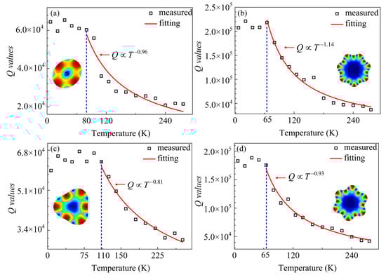 The Q values vs. the temperature are plotted in Figure 6. As can be seen from Figure 6a,b, for the 37 μm-radius resonator, the turnover temperature of the 2nd and 7th modes are 80 K and 65 K, respectively, indicating that the AKE plays a more important role in the high-order modes. The Q-T dependences were quantitively evaluated using the allometric fitting method with the temperature between the turnover points and 293 K. The Q dependence of T−1.14 for the 7th WGM was stronger than that of T−0.96 for the 2nd WGM. Similarly, for the 18 μm-radius counterparts, as shown in Figure 6c,d, the turnover temperatures of the 3rd and 6th WGMs occurred at 110 K and 65 K, corresponding to the Q dependences of T−0.81 and T−0.93, respectively. For both two types of resonators, with temperatures below the turnover points, the Q values are insusceptible to the temperature, consistent with the tendency that the AKE can be overridden by other loss sources at lower temperatures. Furthermore, as illustrated in Figure 3, for the low-order modes, the temperature-independent anchor loss becomes the limiting mechanism when the temperature drops below the turnover point. As for the high-order modes, the anchor loss is negligible, the fabrication process induced damage and defects might be the main loss source [50,51].