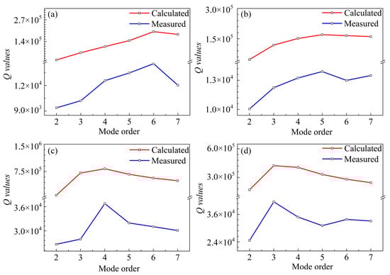 With the Q values of individual loss sources are explicitly expressed, the overall values in different conditions can be evaluated using (4). To further verify the efficiency of the proposed theory, the theoretical values are compared with the measured results. As shown in Figure 7, for both 37 and 18 μm-radius resonators in air and vacuum, the calculated and measured tendencies are consistent. However, the calculated values are far beyond the experimental ones. Firstly, the simulations were carried out based on the ideal models, while the actual Q values can be affected by the fabrication process tolerances, parasitic effects, and so on. In addition, the one-pair of electrode configuration with the traded-off electrode angle was employed for multi-mode excitations. When propagating in the whole disk, the vibrations driven with one electrode are more prone to decay due to various loss sources and defects in the device. Besides, the limited driving force results in the sensing signals more susceptible to the distortions caused by feedthroughs. What is more, some other losses, like electrical damping, process induced damage, and surface loss, were not involved. These losses could contribute to the energy dissipation. According to (4), the calculated Q values could be overestimated due to the absence of such loss sources.