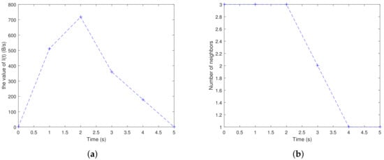 Figure 3 shows the variety of effective information traffic and number of neighbors for a node in a period of time. The node gradually moves from the center area to the edge area. It can be found that at the time of 0 s, the number of neighbors is 3, but there is no data is forwarded to the node, and the effective information flow is 0. The value of I(t) is increased after forwarding at 1 s and 2 s, with the number of neighbors is 3. At 3 s, 4 s, and 5 s, the I(t) decreased to 0.