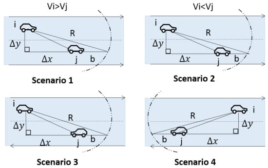 Scenario 1: and have the same direction, and . is the changing distance between node i and j in the period of . is the distance on the x-axis, is the distance on the y-axis. R is the range of vehicle wireless communication. In this scenario, can be formulated as: