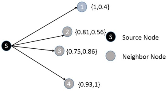 The actual situation is often contrary to the ideal state. Usually, the neighbor nodes perform well in one aspect and mediocre on the other. For example, in Figure 6 (two parameters had normalized), each nodes can be expresed by and ,.