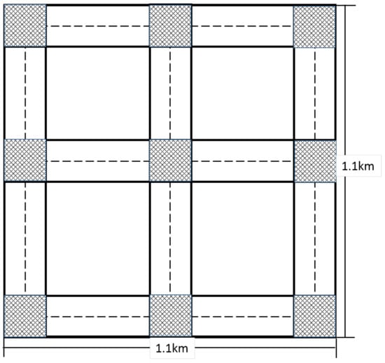 As shown in Figure 9, there are 12 streets and nine intersections in the simulation area. The nodes in this area are placed randomly at the beginning, and they move to a random destination with a speed not exceeding 15 m/s.