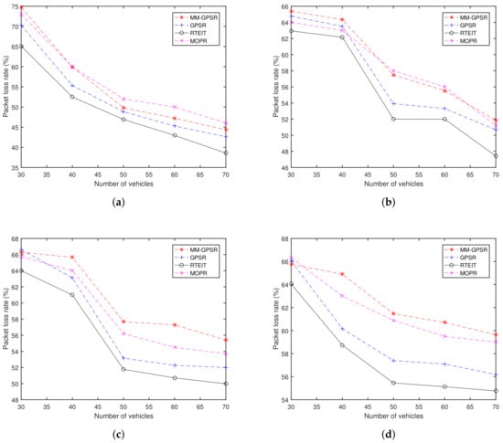 Packet loss rate for varying the number of vehicles and CBR connections: (a) 5 CBR connections; (b) 10 CBR connections; (c) 15 CBR connections; (d) 20 CBR connections.