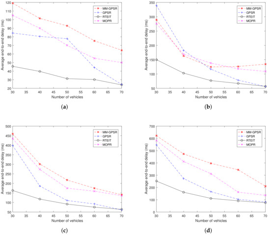 Figure 11 shows the end-to-end delay for varying the number of vehicles and CBR connections. It can be noted from Figure 11 that as the number of nodes increases, the performance of end-to-end delay becomes better in three protocols. Compared with GPSR, MOPR, and MM-GPSR, RTEIT obviously has smaller end-to-end latency. For instance, the end-to-end delay of RTEIT is about 20% lower than GPSR, 40% lower than MM-GPSR, and 30% than MOPR.In the process of successful transmission, the end-to-end delay is mainly determined by the number of hops. When the vehicle nodes are sparse, the packets frequently enter recovery forwarding mode which generates more hops in the routing. That can explain why the performance of end-to-end delay at 70 vehicles is clearly better than results at 30 vehicles. For GPSR, MOPR, and MM-GPSR, due to the lack of adequate consideration about network environment, data packets are likely to enter sparse road segment where the connection between nodes is not sufficient and more likely to encounter topological holes. For RTEIT, the establishment of routing is determined by real-time information traffic and vehicle movement. Due to the poor connectivity, the nodes around the topology hole frequently enter the recovery mode and have lower real-time information traffic in the calculation of vehicle utility value. Nodes with more available connections have a higher priority in routing. By choosing the next hop with high connectivity, RTEIT can minimize the use of recovery strategy, resulting in lower end-to-end delay than GPSR, MOPR and MM-GPSR. In most cases, GPSR outperforms the MM-GPSR because MM-GPSR provides a scheme that uses a fixed transport factor to determine the communication area Q, thus the value of is not suitable for the scenarios used in the experiment. From Figure 11d, the value of maximum end-to-end delay for MM-GPSR is 620 ms, for GPSR is 560 ms, and for RETIT is 240 ms. The values of minimum end-to-end delay for these protocols are 280, 120, 170, and 100. The gap between traditional protocols and RETIT on end-to-end delay reduces with the increase in the number of nodes. This clearly demonstrates that RETIT has superiority compared with MM-GPSR, MOPR, and GPSR. In Figure 11b, it can be found that MM-GPSR outperforms GPSR at 30 and 40 vehicles. This result can be interpreted as: the benefits of fixed parameters equal to 0.3. From Figure 11, it also can be found that with the increase in the number of CBR connections, the end-to-end delay increases. More CBR connections lead to more serious network load, which prevents the nodes from forwarding the data packet just received because the packets in the queue have higher priority.