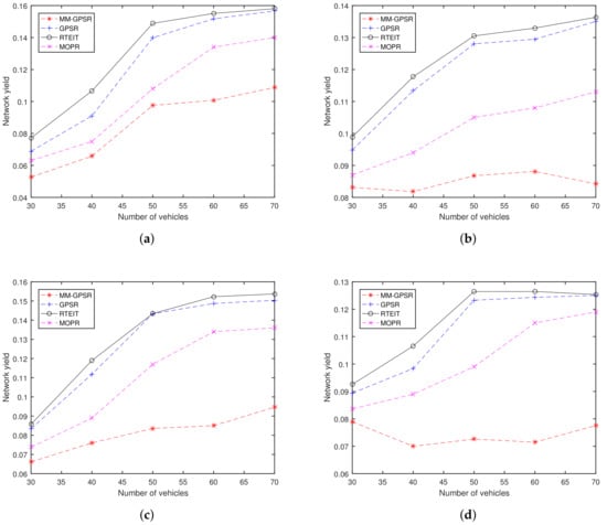 Figure 12 shows the network yield for varying the number of vehicles and CBR connections. The network yield represents the comprehensive performance of a network, which similar to the goodput. For example, when the packet loss rate increases, the number of packets that reach the destination becomes smaller, thus, the value of network yield is small. In the same condition of packet loss rate, a route with a large number of hops will have a negative impact on network yield. From Figure 12, it can be found that when the number of nodes increases, the performance of network yield is better (with exception of Figure 12d, where the number of CBR connections is 20, the results of MM-GPSR are similar). The main reason to limit the performance in a sparse network is that the network connection is not enough due to the small number of nodes. Actually, location-based greedy forwarding mode is very suitable for well-connected networks due to this scheme aims to obtain the minimum number of hops. From Figure 10 and Figure 11, we can found that RETIT has a lower packet loss rate and lower end-to-end delay. Obviously, our proposed RTEIT has a higher network yield in a sparse environment by comparing with GPSR, MOPR, and MM-GPSR in all set of CBR connections. These results can be interpreted as: (1) link utility considers both one-hop transmission distance and link stability, which increases the packet delivery ratio and reduces the number of hops; (2) effective information traffic leads nodes to find a correct path to a destination which can avoid path redundancy.