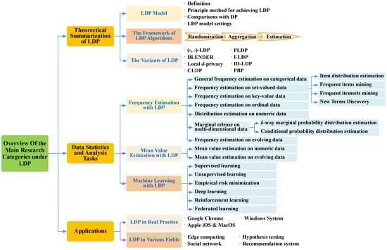 Therefore, a comprehensive survey of LDP is very necessary and urgent for future research in Internet of Things. To the best of our knowledge, only a little literature focuses on reviewing LDP and the most existing surveys only pay attention to a certain field. For example, Wang et al. [] summarized several LDP protocols only for frequency estimation. The tutorials in [,,] reviewed the LDP models and introduced the current research landscapes under LDP, but the detailed descriptions are rather insufficient. Zhao et al. [] reviewed the existing LDP-based mechanisms only towards the Internet of connected vehicles. The reviews in [,] also provided a survey of statistical query and private learning with LDP. However, the detailed technical points and specific data types when using LDP are still insufficiently summarized. Therefore, it is still necessary and urgent to carry out a comprehensive survey on LDP toward data statistics and analysis to help newcomers understand the complex discipline of this hot research area.