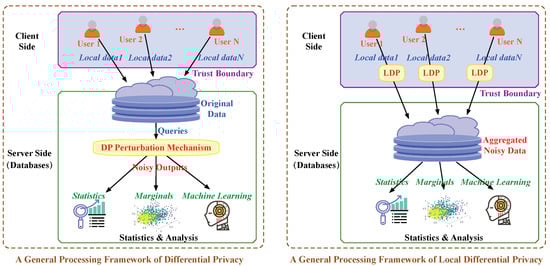 We compare LDP with global DP from different perspectives, as shown in Table 2. At first, the biggest difference between LDP and DP is that LDP is a local privacy model with no assumption on the server while DP is a central privacy model with the assumption of a trusted server. Correspondingly, the general processing frameworks of DP and LDP are different. As shown in the left part of Figure 2, under the DP framework, the data are directly sent to the server and the noises are added to query mechanisms in the server-side. In contrast, under the LDP framework, each user’s data are locally perturbed in the client-side before uploading to the server, as shown in the right part of Figure 2.