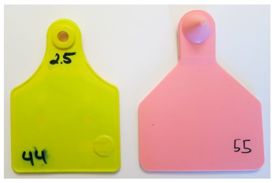 The tests were conducted with two different types of UHF transponder ear tags, which both were functional models and were not commercially available. Type A contained a transponder with a planar inverted F-shaped (PIF) antenna approx. 50 × 50 mm2 in size (deister electronic GmbH, Barsinghausen, Germany). It was combined with an Impinj Monza® 4D chip (Impinj Inc., Seattle, WA, USA) and integrated into a Primaflex® cattle ear tag (Caisley International GmbH, Bocholt, Germany) by injection molding (Figure 1). Type B was a functional model provided by Scot EID Livestock Traceability Research (Huntly, United Kingdom). It contained an Alien Garment Tag (GT) (ALN-9728, Alien Technology LLC, San José, CA, USA) with a dipole antenna and an Alien Higgs® 4 chip. This tag was 50 × 30 mm2 in size. It was encapsulated in an air-filled pocket moulded onto a regular two-piece ear tag for cattle.