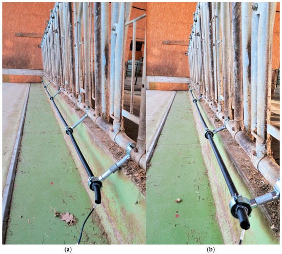 Two different mounting positions of the antenna were tested (Figure 2). Since pre-tests showed that the antenna field was weakened severely in proximity to reinforced concrete or metal, the antenna was mounted with a distance to the feed fence and the wall below the fence. For this purpose, six paired pipe clamps (clamp diameter 2 inch at the fence, 1 inch at the antenna) were mounted to the feed fence and connected with a metal pipe (diameter 0.5 inch). The first pair of clamps was mounted at a distance of 26 cm to the left side wall of the barn compartment. The other clamps followed along the feed fence at distances of 179, 157, 161, 150 and 68 cm to fit in between the feeding places. The 1” clamps were filled with a rubber foam to hold a flexible polyvinyl chloride (PVC) pipe (PLICA UV-FLEX M25, Plica AG, Frauenfeld, Switzerland). The antenna was inserted into the flexible PVC pipe, so that it was mechanically protected and could not touch the metal clamps.
