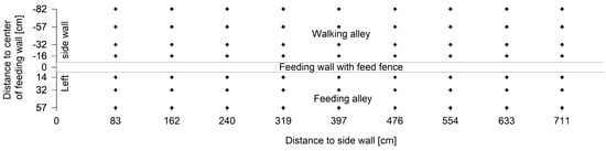 Coordinate grid for reading range measurements in front and behind the feed fence. Measurements were conducted at heights of 30, 55, 80 and 105 cm above the floor. Each x-coordinate represents the centre of a feeding place along the feed fence.