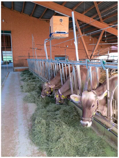 In addition, all cows were equipped with a sensor ear tag of the Smartbow® system (Smartbow GmbH/Zoetis Services LLC, Weibern, Austria). This system measures the location of the ear tags in real-time by using the Time Difference of Arrival principle. For this, 7 receiver antennas were mounted on the walls of the northern barn compartment. The operating frequency of the system is 2.4 GHz. The minimum position error of the system was estimated at approximately 1.2 m by Wolfger et al. []. For the purpose of measuring the time spent at the feed fence, an area along the feed fence, extending from approx. 0.4 m behind to 1.6 m in front of the feed fence, was defined in the system software. In this way, the visiting time of the cows in this area could be extracted from the data.