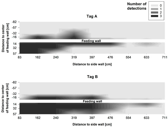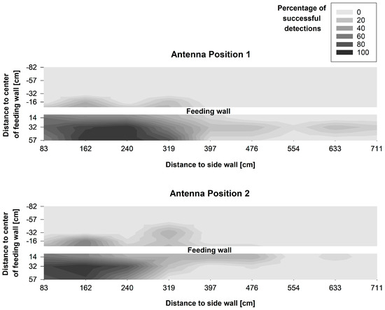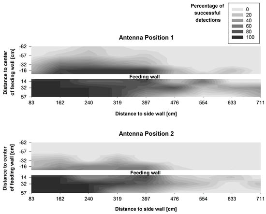 For the data analysis of this experiment, the number and percentage of successful detections for each coordinate was calculated per type of tag and antenna position for each height separately and over all heights. At maximum, 12 detections were achievable during the measurements of three tags in four heights (only three heights at the coordinate +14 cm), resulting in a detection rate of 100%. With these data, contour plots were created using Sigmaplot 13 (Systat Software Inc., San José, CA, USA) for graphical analysis of the data. Furthermore, the number of coordinates with at least one successful detection over all heights in front of and behind the feed fence was calculated for each antenna position and type of ear tag.