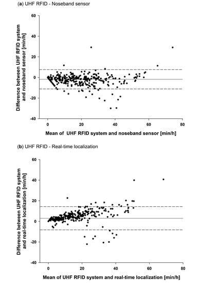 It can be assumed that measuring the jaw movements of the animals with the noseband pressure sensor is the most direct and, hence, most accurate measure of eating time of the three systems compared. Since the pressure sensor is mounted on the animal, it can measure eating at all times and any place in the barn, while both the UHF RFID system and the real-time localisation only record the time spent at the feed fence. Especially the eating time in a concentrate feeding station was not measured by the two other systems, probably explaining some of the strong negative outliers in Figure 9a and the average longer feeding durations measured with the noseband pressure sensor. Positive differences between the UHF RFID system and the noseband sensor, which also occurred, were most likely caused by cows which were registered at the feed fence, but did not actually eat.