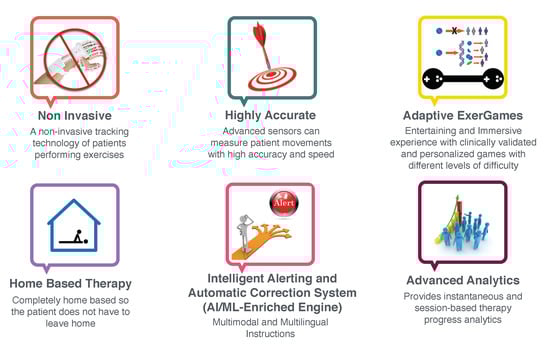 We believe there are some unique features that can overcome the mentioned challenges, which are illustrated in Figure 1. Advanced 3D motion capture devices can lay the groundwork for developing noninvasive and home-based physiotherapy solutions, while maintaining highly accurate monitoring of patient’s performance in real-time. On the other hand, a successful telerehabilitation platform should provide instantaneous and session-based therapy progress analytics. Moreover, using the power of AI and intelligent algorithms, a personalized set of exercises should be developed within an adaptive serious game framework, which we refer to as “adaptive exergames”, so that patients can have an entertaining and immersive experience with clinically validated and personalized games that adapt to different levels of difficulty.