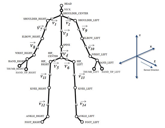 Figure 3. Body joints and vectors as detected by the Kinect sensor. - The system also computes for each frame the overall matching percentage between all bones from the frame of the patient and their corresponding ones from the registered posture of the virtual assistant. The matching percentage is calculated by dividing the 3d ratio of rotational deviation over the interval of range of motion. For instance, Figure 4 shows the estimated neck lateral bending ROM is between ( (left), (right)). Thus, the estimated percentage of errors is 33% resulting from the 15% deviation of the neck lateral bending towards the right. In this manner, for each bone, the system starts the matching process at the local scale, then calculates the nearest indicator for every vector, after that produces an abstracted matching indicator of the whole body posture relative to the virtual bot (Lines 9–10).
