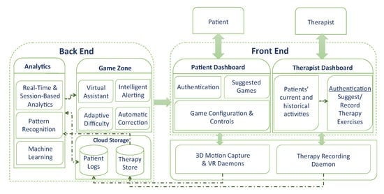 This section demonstrates the system architecture overview and discusses how its two types of users—therapists and patients—can interact with it. The aim of this platform is to produce a serious game for physical rehabilitation that is proactive, adaptive and personalized. Figure 5 demonstrates the three essential components of the platform. These are (1) the frontend component, which includes dashboards for the patients and therapists as well as the adaptive game; (2) the processes component, which includes all the processes that run in the background and collect data from the therapists and patients; and (3) the backend components that comprise the intelligence of the game’s engine, the three methods of analytics, and the storage residing at the cloud.