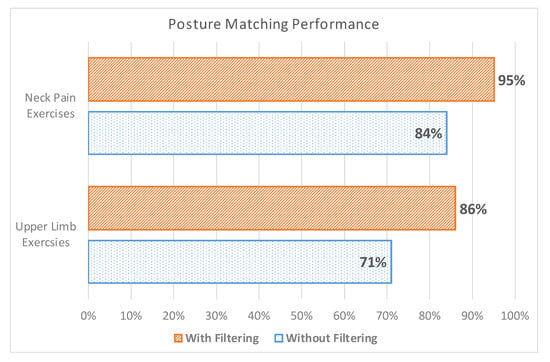 Moreover, we designed an experiment to measure the accuracy of the posture matching algorithm by comparing its performance in detecting the right posture and detailed user gestures dynamically. For that purpose, we compared the original approach that uses the basic body tracking available in the Kinect 2 without filtering, against the approach that is based on the double-staged filter described in Algorithm 1. Figure 14 demonstrates our analysis based on two sets of exercises: (i) upper limb exercises and (ii) neck pain exercises. Upper limb exercises (e.g., for lower back pain, hand, and shoulder therapies) comprise more complex body gestures that can sometimes be challenging to detect due to overlapping joints from the Kinect perspective. The other factors that may affect the capturing performance are (1) the user going out of the field of view of the Kinect and (2) signal fluctuation. The results show a better performance by using the smoothing technique in both sets of exercises. The neck pain exercises are easier to detect due to no overlapping joints, and thus shows a high detection rate when using filtering because of the previously mentioned factors.