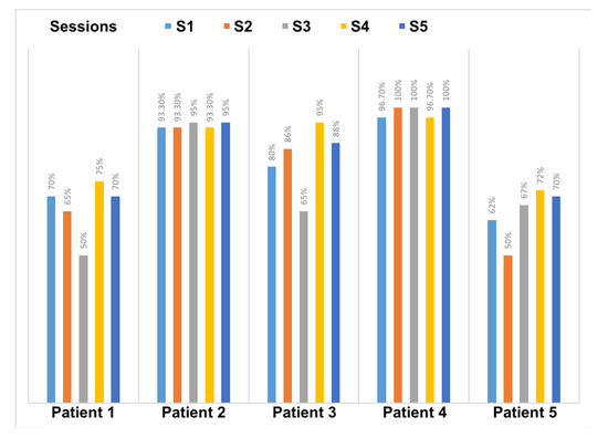 On the other hand, we evaluated the average percentage of correct gestures performed by patients over different sessions. Figure 15 demonstrates the results of patient performance in each session. This result considers all the gestures required in a given prescribed therapy. The threshold adopted to consider a given gesture as correctly performed is 80%. Thus, gestures performed with a lower matching percentage are considered as being not acquired. The overall performance of the users shows a general increasing of correctness percentage, with some patients were performing better than others, mainly those who adhered to the gaming environment faster.